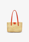 Bolso Mercules confeccionado en tejido de palma con asas en piel. Flecha Mercules dorada estampada en el frente sobre piel.