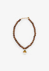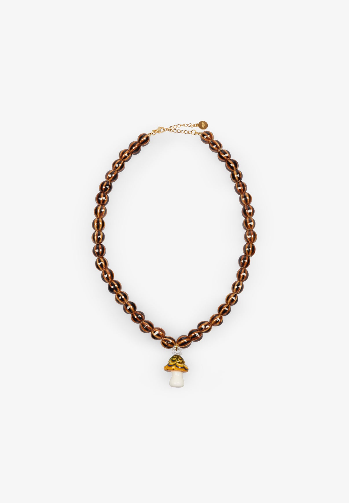 Collar Minerva confeccionado en cuentas de cerámica gris y marrón redondas pintadas a mano y un charm de cristal soplado. Cierre de acero inoxidable y alargador de 5cm.