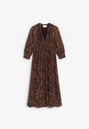 Vestido Bash confeccionado en 100% viscosa. Presenta un corte midi en forma de A, cintura ajustada, mangas largas abullonadas, fruncido en escote y cintura y cierre con botones en la parte delantera.