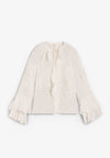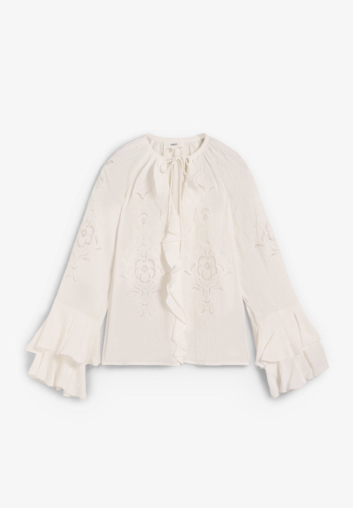 Blusa Bash confeccionada en 68% viscosa y 32% algodón. Presenta un corte holgado, mangas largas, detalles de volantes, escote en pico, cierre con lazo y bordado inglés.