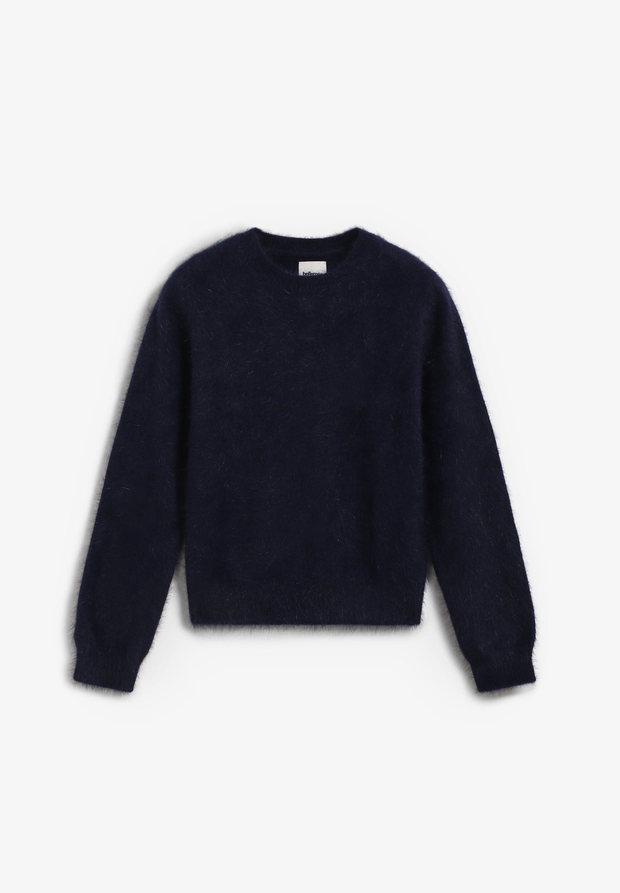 Jersey Bellerose confeccionado en 65% angora y 35% poliamida. Presenta un ajuste clásico, mangas largas, cuello redondo y ribete acanalado.