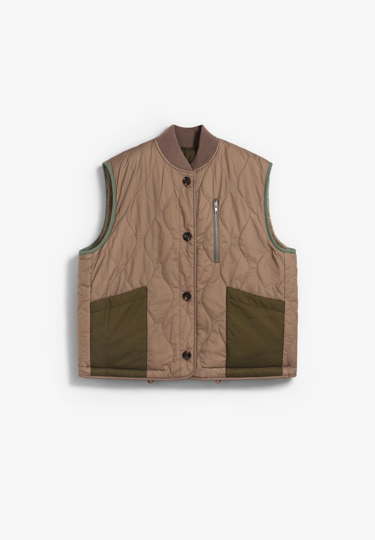 Chaleco reversible Bellerose confeccionado en 100% poliamida y forro de poliéster. Cuenta con forro polar con bolsillos de solapa en contraste por un lado y tejido acolchado con bolsillos de solapa en contraste en el otro. Cuello estilo bomber acanalado, detalles del canesú, dobladillo ajustable con cordón y cierre de botón.