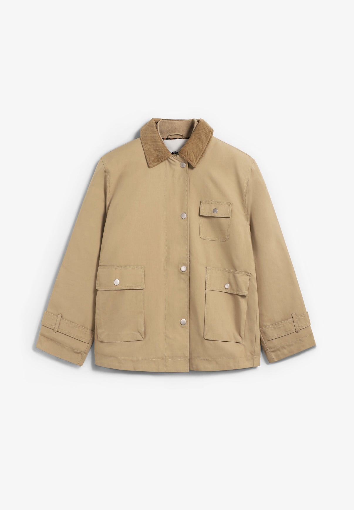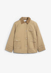 Chaqueta Bellerose confeccionada en 100% poliéster y ajuste relajado. Cuenta con cuello estilo camisa en pana tonal, cierre con cremallera oculta y botón a presión, bolsillo con solapa en el pecho y dos bolsillos delanteros. Puños ajustables con lengüetas, abertura central trasera y forro acolchado con estampado de leopardo en contraste.