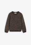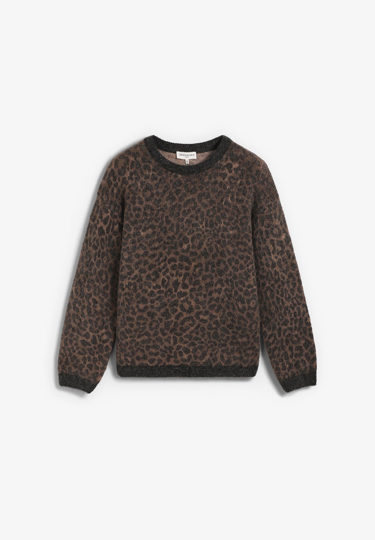 Jersey Grace & Mila confeccionado en 53% acrílico, 28% nailon, 10% lana, 6% mohair y 3% elastano. Presenta un corte holgado, cuello redondo, puños y bajo en contraste y estampado de leopardo.