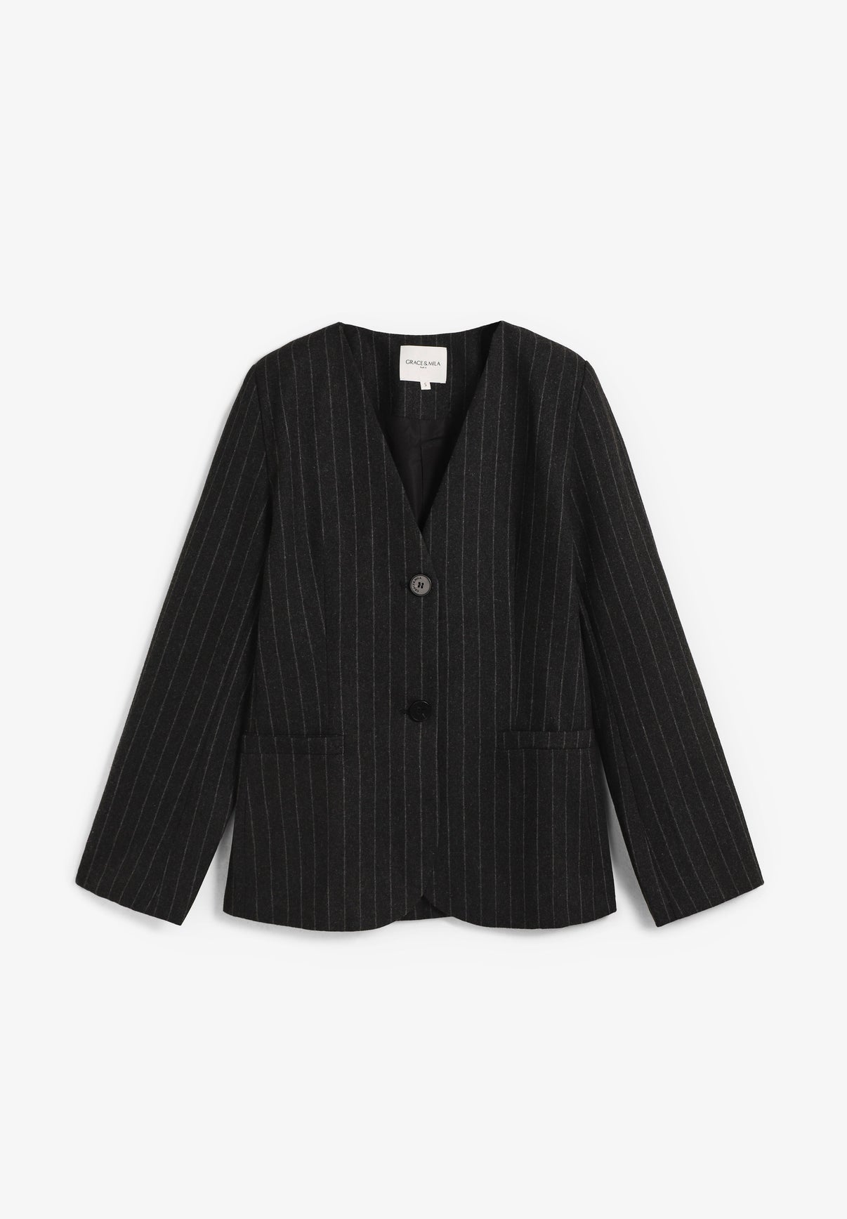 Blazer Grace & Mila confeccionada en 85% poliéster y 15% lana. Presenta un diseño de rayas en contraste, sin cuello y con un corte entallado. Está forrada e incorpora un cierre de botonadura sencilla y bolsillos de ribete en la parte delantera.