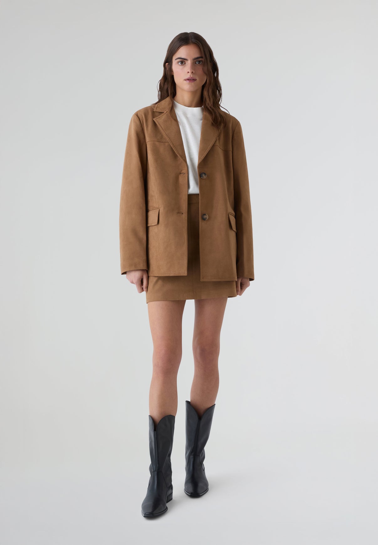 Americana Grace & Mila confeccionada en 90% poliéster y 10% elastano. Esta prenda se inspira en la sastrería clásica con un toque contemporáneo. El tejido de ante y el corte recto crean una silueta estructurada. Presenta detalles como cuello de solapa, bolsillos delanteros con solapa y tapeta de botones.