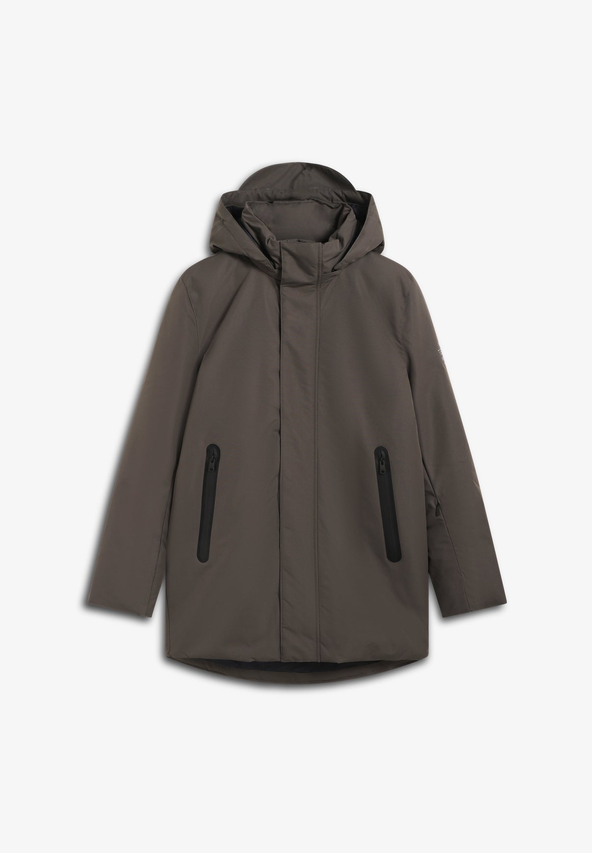 Abrigo Ecoalf confeccionado en poliéster reciclado. Presenta un acabado repelente al agua, corte regular, tapeta frontal con broches ocultos y cierre frontal con cremallera bidireccional, capucha desmontable con cremallera, bolsillo con cremallera invisible en la manga izquierda, costuras termoselladas en el interior y puños interiores elásticos,