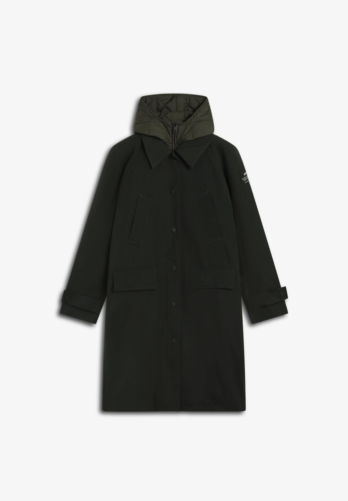 Abrigo Ecoalf confeccionado en 54% poliéster reciclado y 46% algodón orgánico. Presenta un corte relajado y un largo por encima de la rodilla. Cuenta con una tapeta frontal cerrada con botones, cuello de camisa, bolsillo con solapa en la cintura y tipo jet en el pecho. Puños ajustables con solapas y abertura trasera. La prenda interior cuenta con cierre de cremallera bidireccional, aberturas laterales, bolsillos tipo jet y cuerpo acolchado con robos. Repelente al agua.