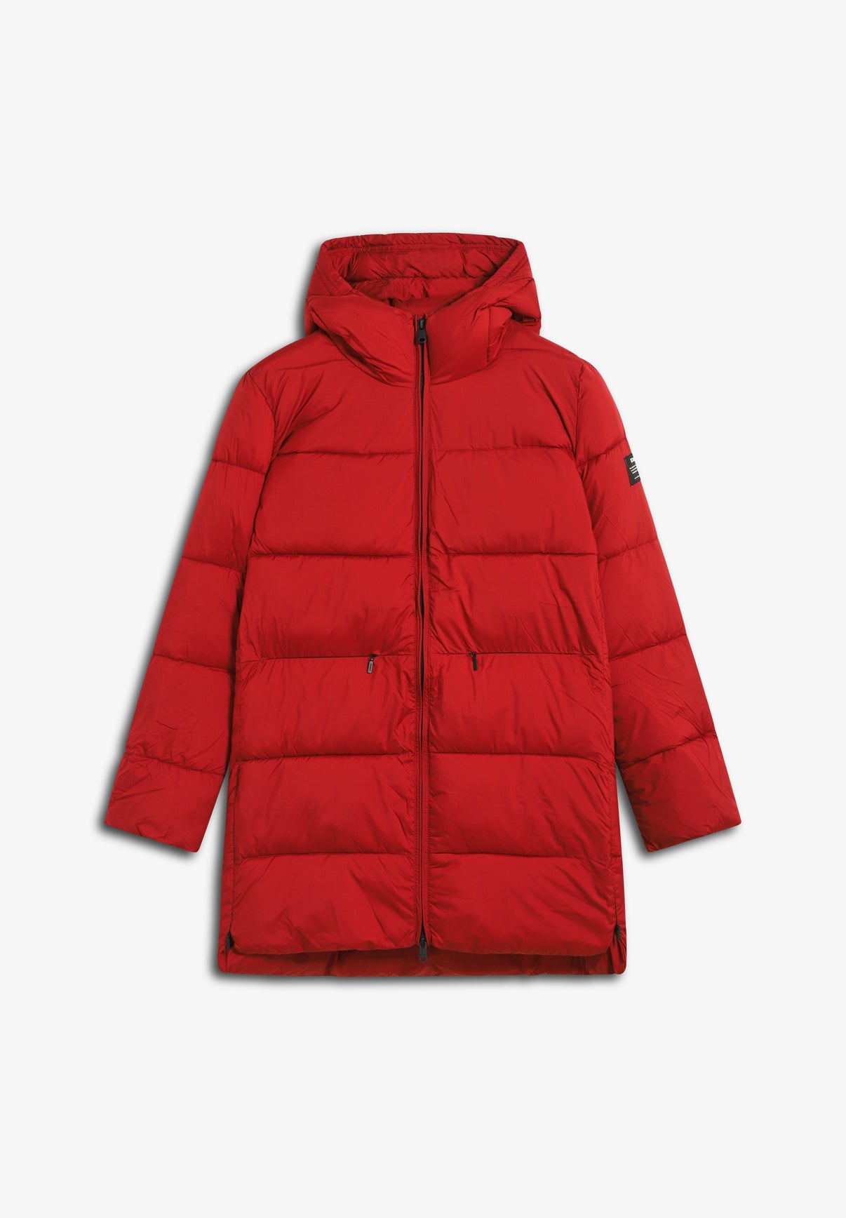 Abrigo Ecoalf confeccionado en 100% poliéster reciclado. Presenta un corte relajado, largo por encima de la rodilla, puños internos elásticos, cierre frontal con cremallera bidireccional, bolsillos horizontales con cremallera, capucha ajustable y es repelente al agua.