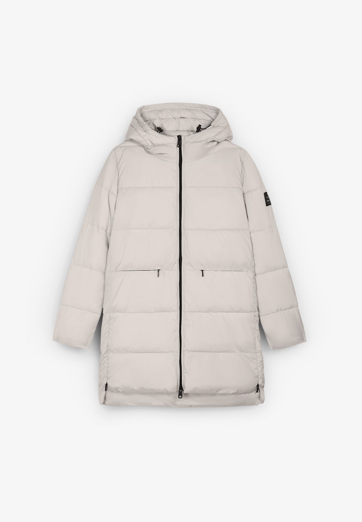 Abrigo Ecoalf confeccionado en 100% poliéster reciclado. Presenta un corte relajado, largo por encima de la rodilla, puños internos elásticos, cierre frontal con cremallera bidireccional, bolsillos horizontales con cremallera, capucha ajustable y es repelente al agua.