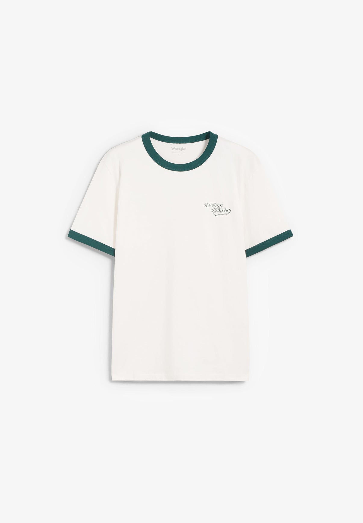 Camiseta Wrangler confeccionada en 100% algodón y un corte relaxed. Cuenta con mangas cortas, bajo recto y pequeño gráfico impreso en el pecho. Presenta detalles ribeteados característicos en el cuello y los puños, firma en el cuello y los puños de las mangas.