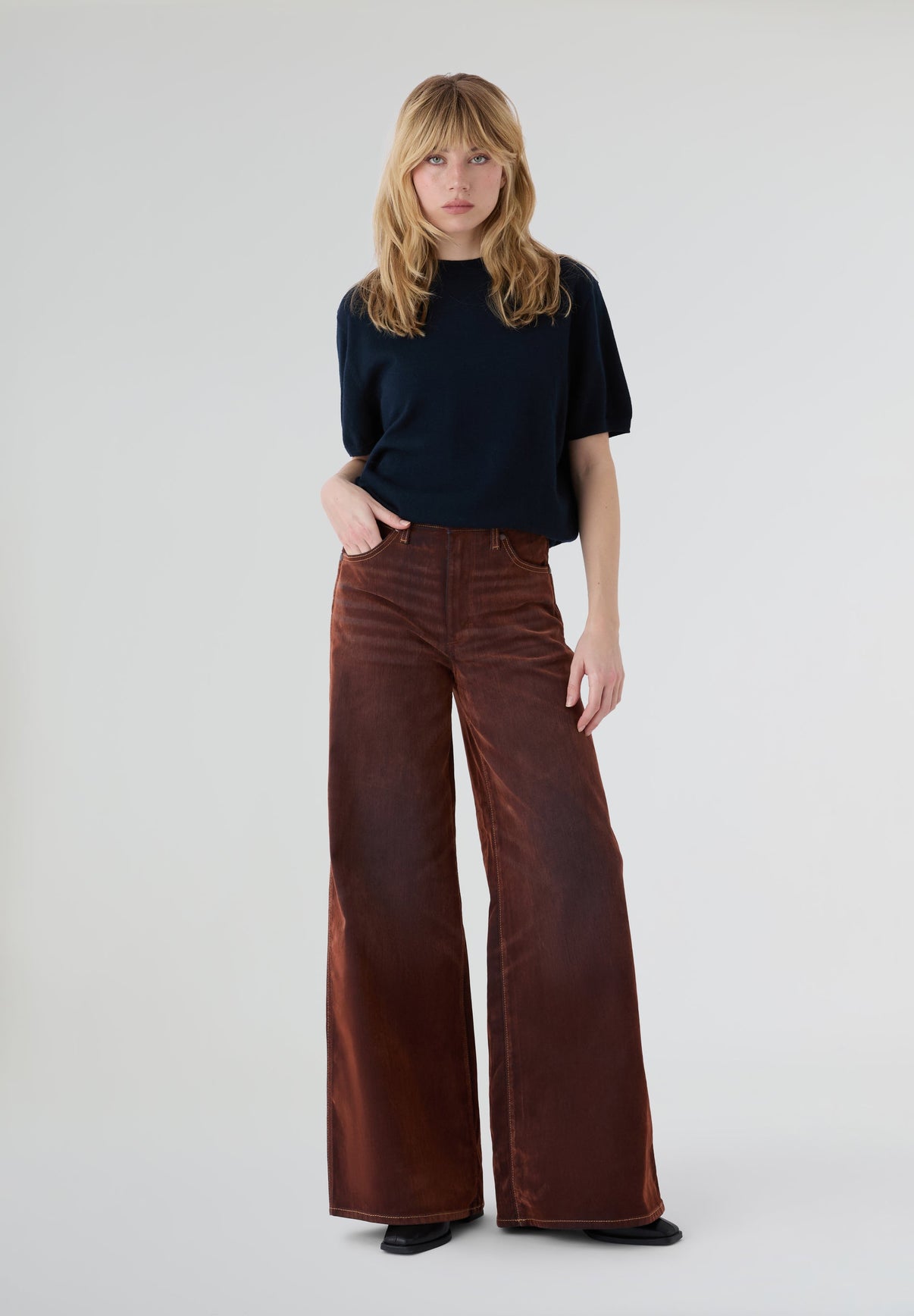 Pantalón vaquero Wrangler confeccionado en 72% algodón, 23% poliéster, 4% viscosa, 1% elastano. Presenta una silueta acampanada, un tiro alto y ajuste ceñido en la cadera. Incorporan trabillas para el cinturón, bragueta con cremallera, cierre de botón y la icónica costura en forma de W junto con un parche de piel en el bolsillo trasero.