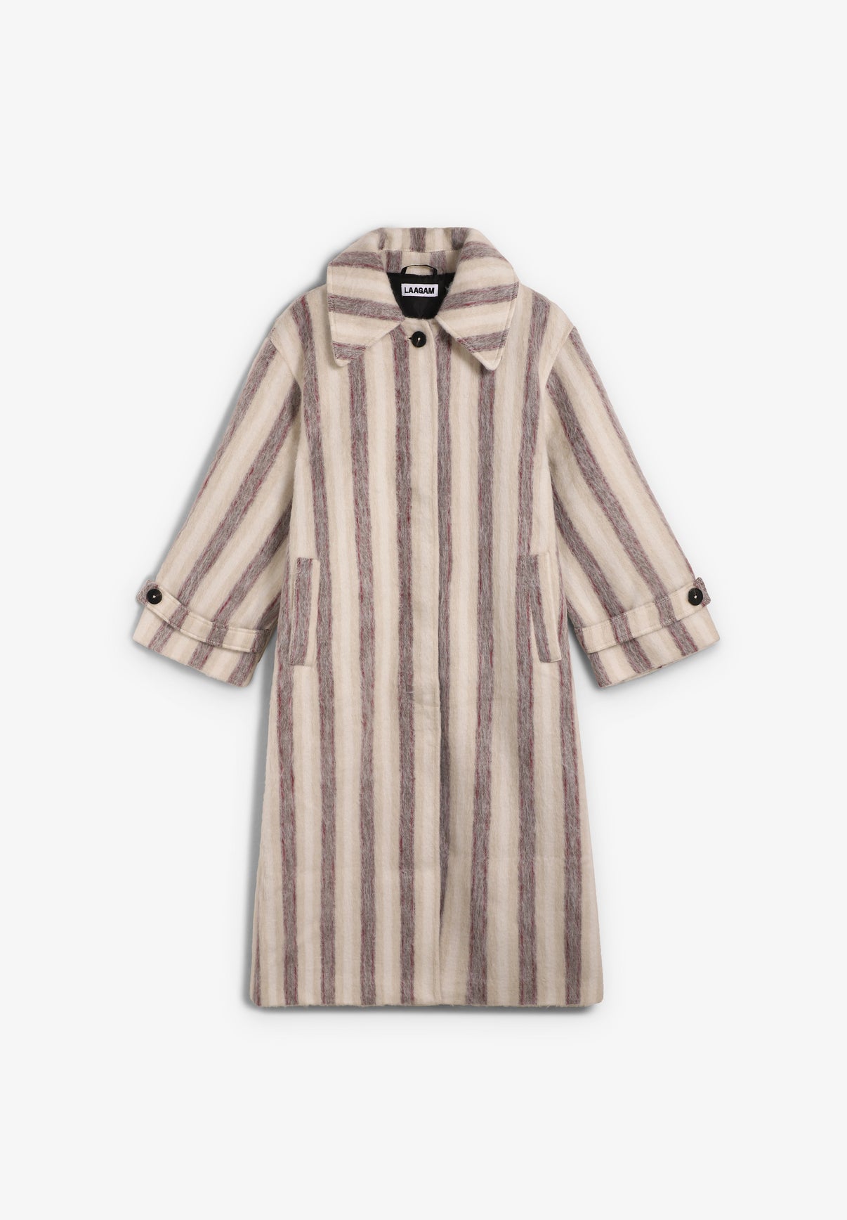 Abrigo Laagam confeccionado en una mezcla de poliéster, acrílico y poliamida. Presenta un diseño de rayas, cuello italiano, tapeta de botones y corte largo y holgado.