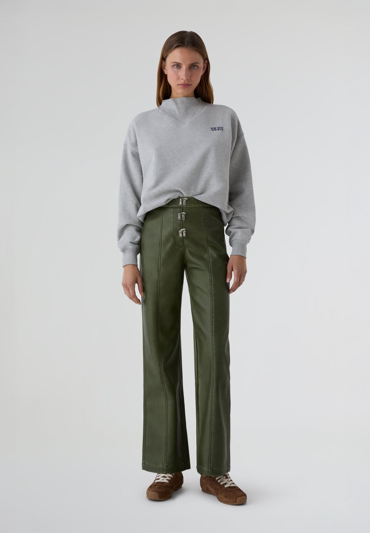 Pantalón Laagam confeccionado en 100% poliéster y corte recto. Presenta un efecto piel de tiro alto con detalles de ganchos metalizados en la bragueta. Cierre con cremallera invisible.
