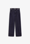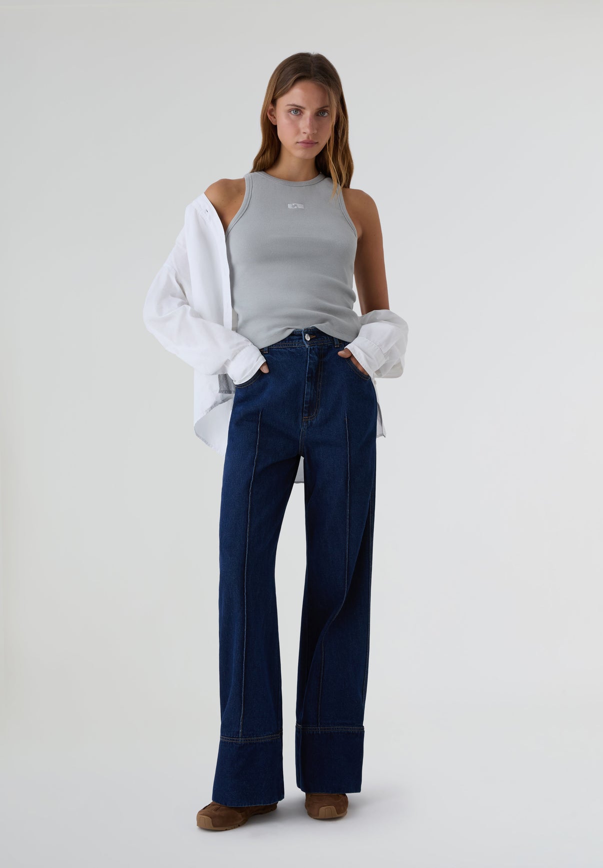 Pantalón vaquero Laagam confeccionado en 100% algodón. Cuenta con tiro alto y pernera ancha. Cinturilla con trabilla, grandes botones en plata metalizada y cierre frontal con cremallera y botón metálico y bolsillos traseros.