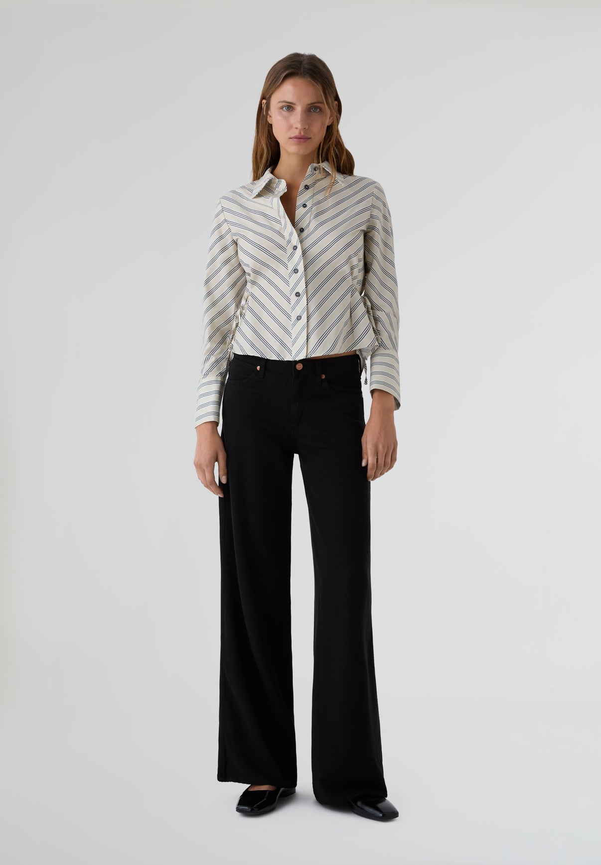 Camisa Laagam confeccionada en 97% algodón y 3% elastano. Presenta cuello estructurado y tapeta frontal abotonada. Corte entallado con lazos laterales para ajustar la cintura, mangas largas con puños anchos y cierre de botones.
