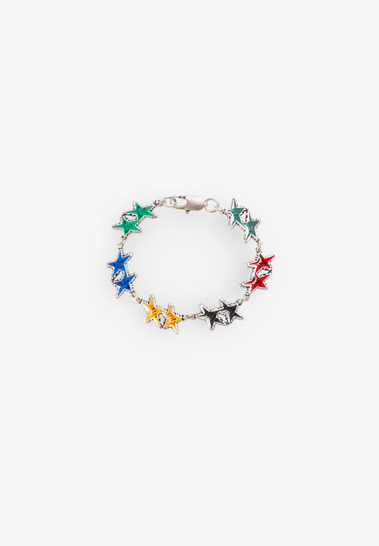 Pulsera Twojeys elaborada con seis logotipos icónicos de doble cara esmaltados sobre latón con una cadena rolo que corre a lo largo de toda su longitud y se cierra mediante un broche de langosta.