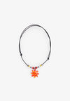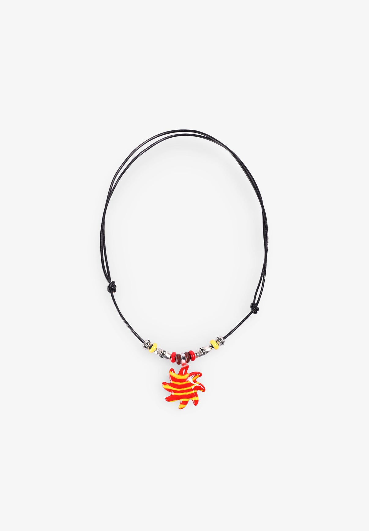 Collar Twojeys construido con una correa de cuero que sujeta el colgante de vidrio tintado. Se puede ajustar tirando y soltando los nudos.