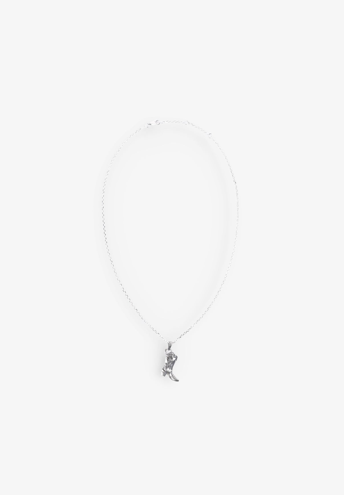 Collar Twojeys elaborado con una cadena de rolo de plata esterilizada 925 que sostiene una bota de vaquero plateada de alta calidad