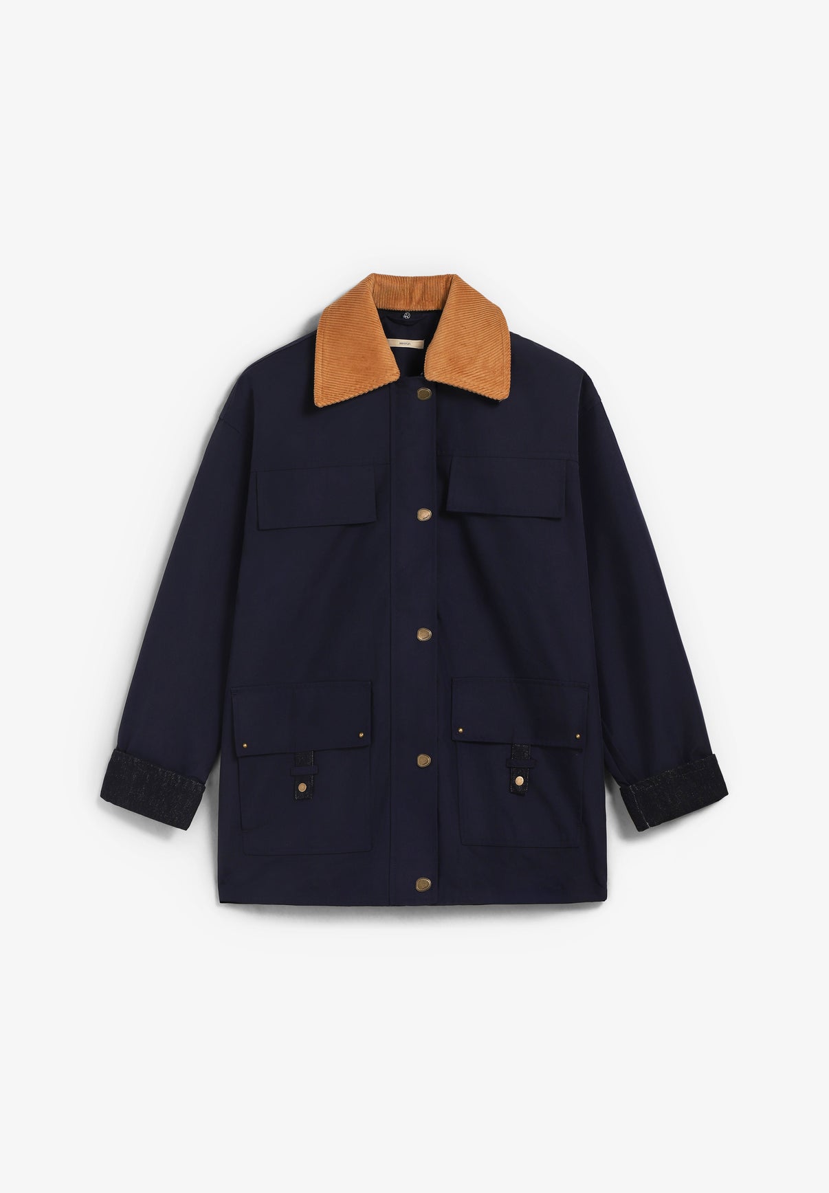 Abrigo Sessun confeccionado en mezcla de algodón orgánico (75%) y poliéster (25%). De estilo utilitario en gabardina ceñida. presenta cuello extraíble a contraste, cierre de cremallera oculta con tapeta y botones tipo joya a presión. Bolsillos de parche con solapa y detalle de tapetas en tejido denim, remaches y botones a presión metálicos.