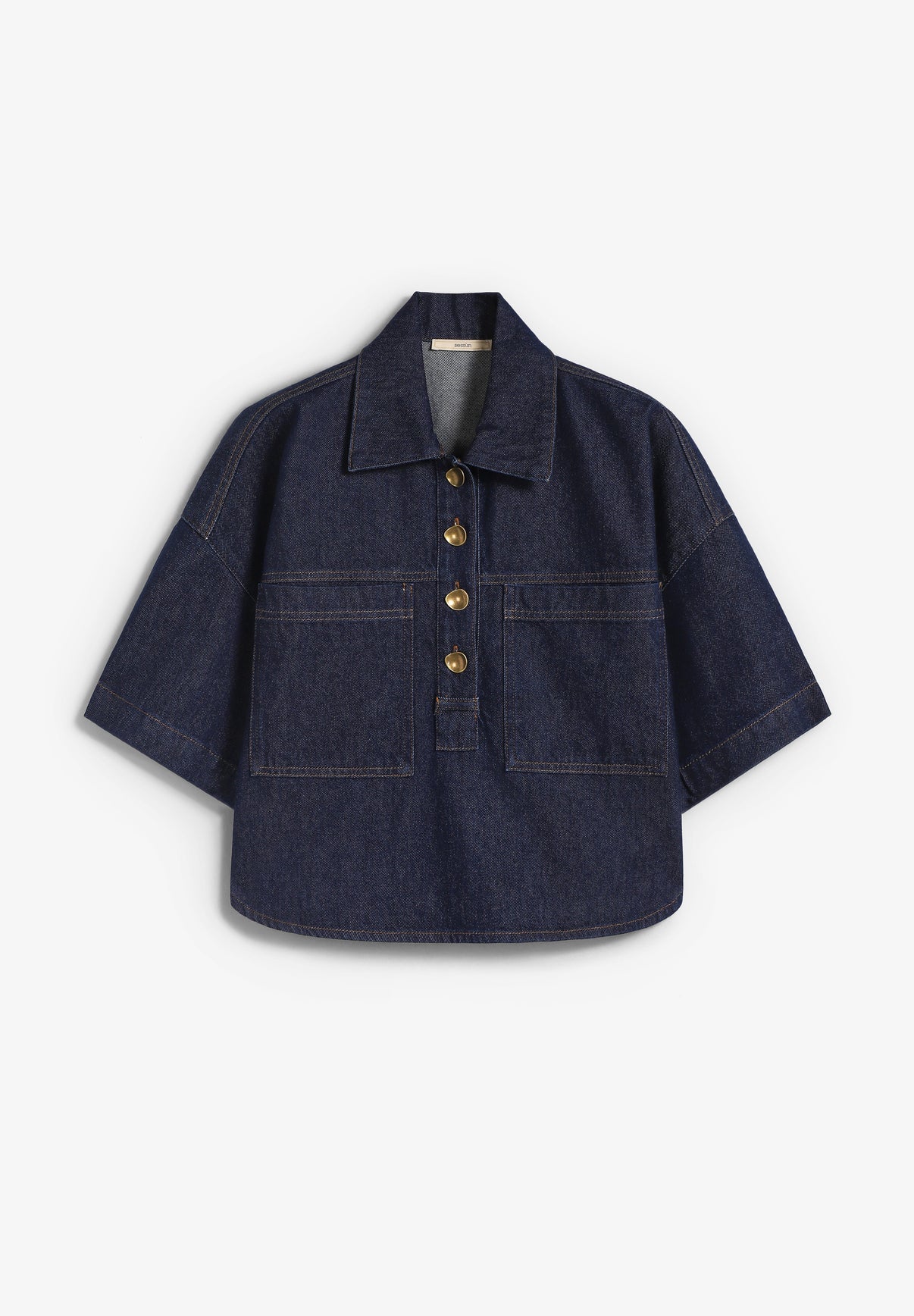 Camisa estilo polo Sessun confeccionada en 100% algodón. Presenta tapeta de polo con botones a contraste tipo joya, manga corta, bolsillos de parche con puntadas a contraste y pliegues planos en la parte trasera.