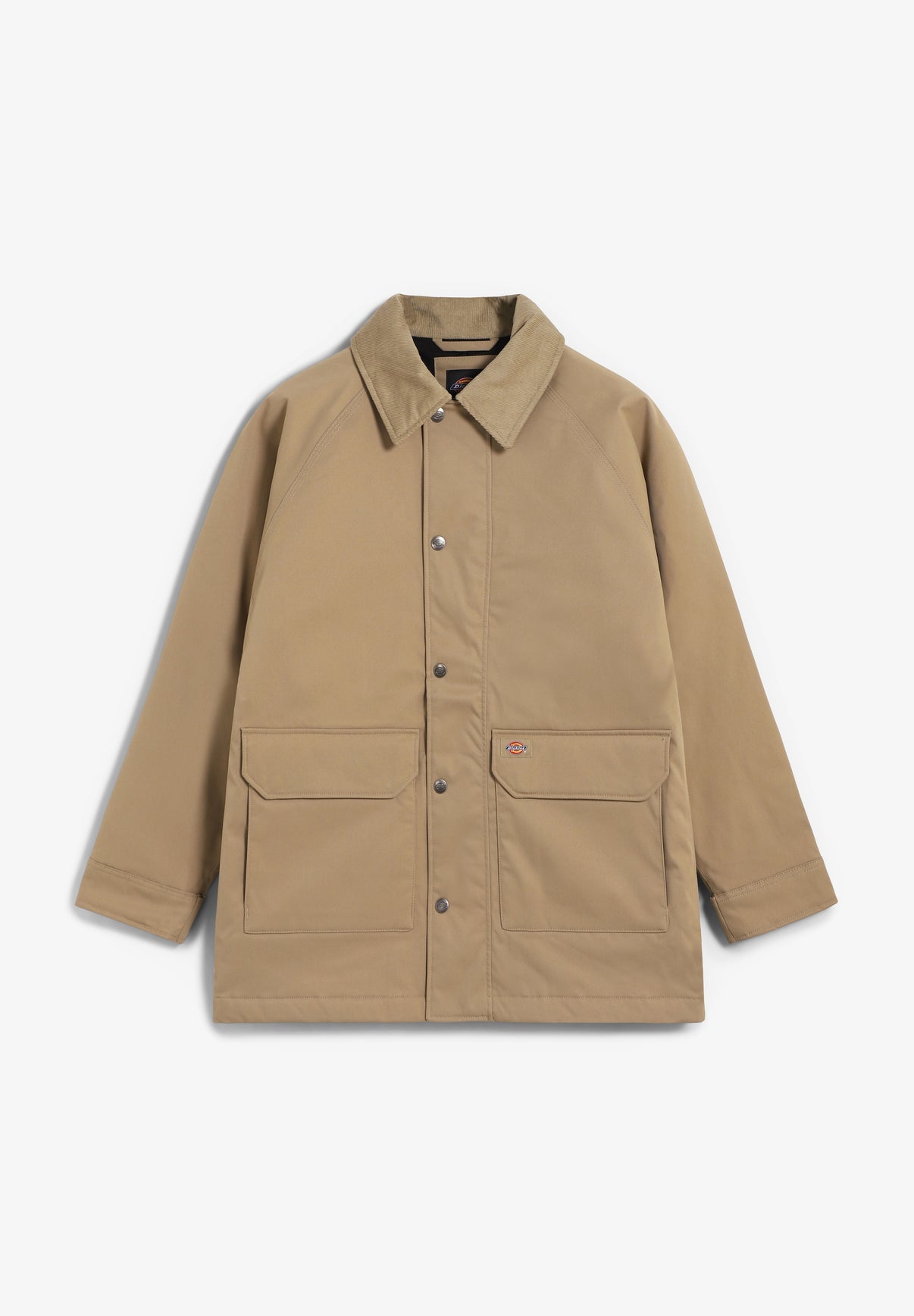 Abrigo Dickies confeccionado en 100% poliéster. Cuenta con cierre con botones a presión con logotipo, cremallera oculta, cuello exterior de pana, bolsillos de parche de entrada lateral en la parte delantera y etiqueta tejida Dickies. Presenta relleno sintético de peso medio para mayor calidez, acolchado de rombos en el cuerpo y mangas y bolsillo interior con cremallera y bolsillo abierto de pana.