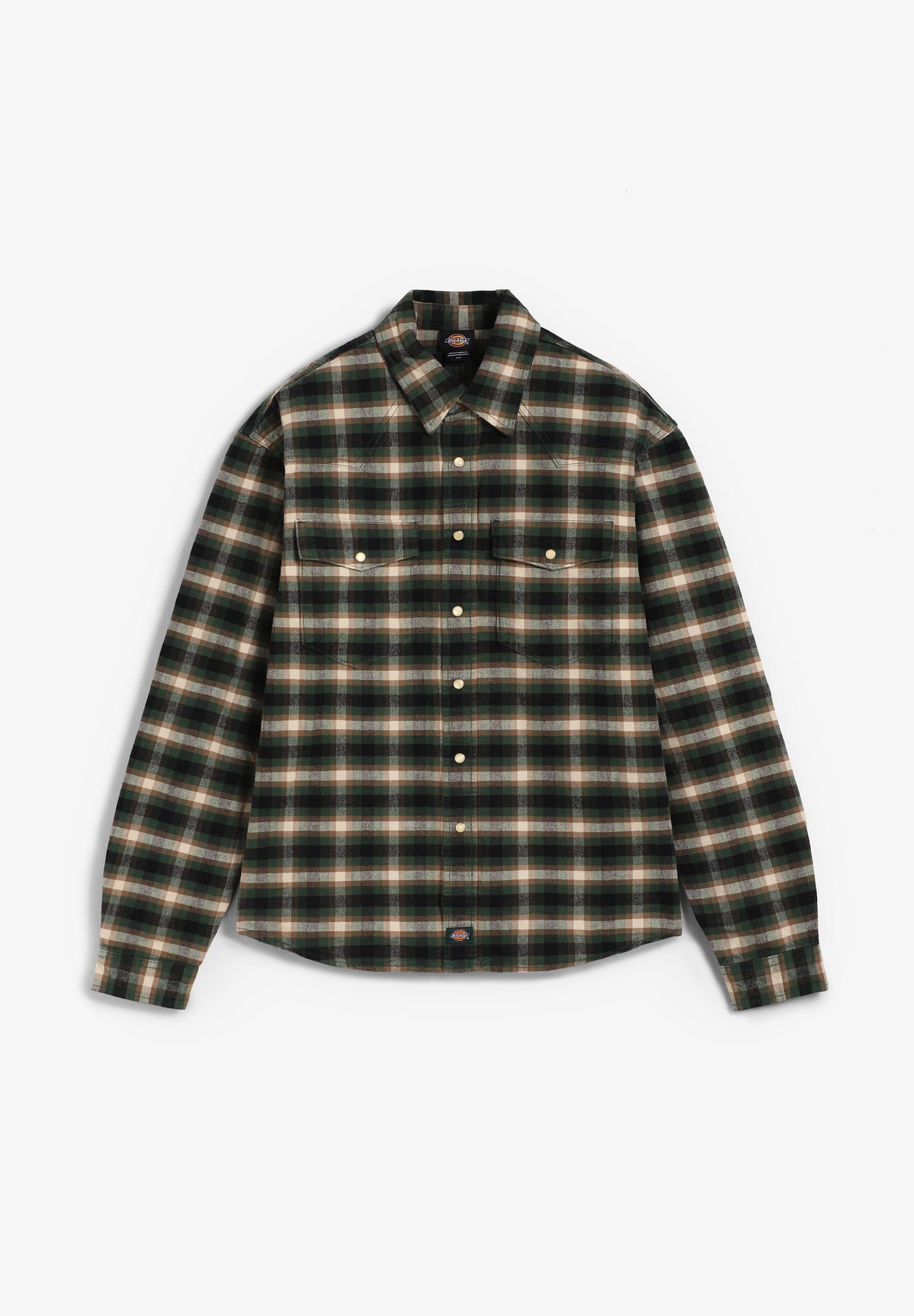 Camisa Dickies confeccionada en franela de algodón cepillado 100% de peso medio y corte holgado. Presenta dos bolsillos en el pecho con solapa y botón de estilo western, bajo redondeado, puños ajustables, snap closure y detalle de etiqueta tejida.