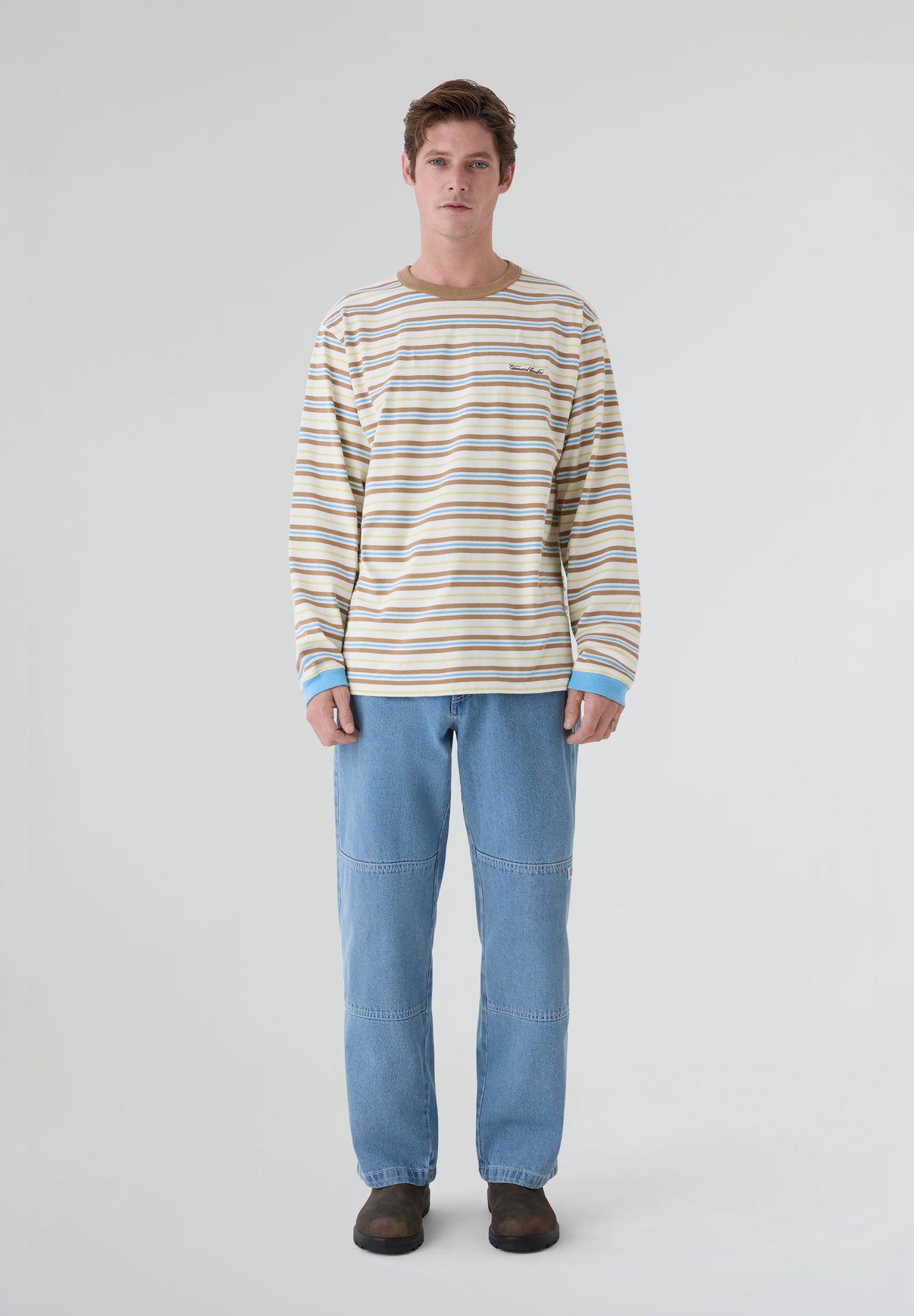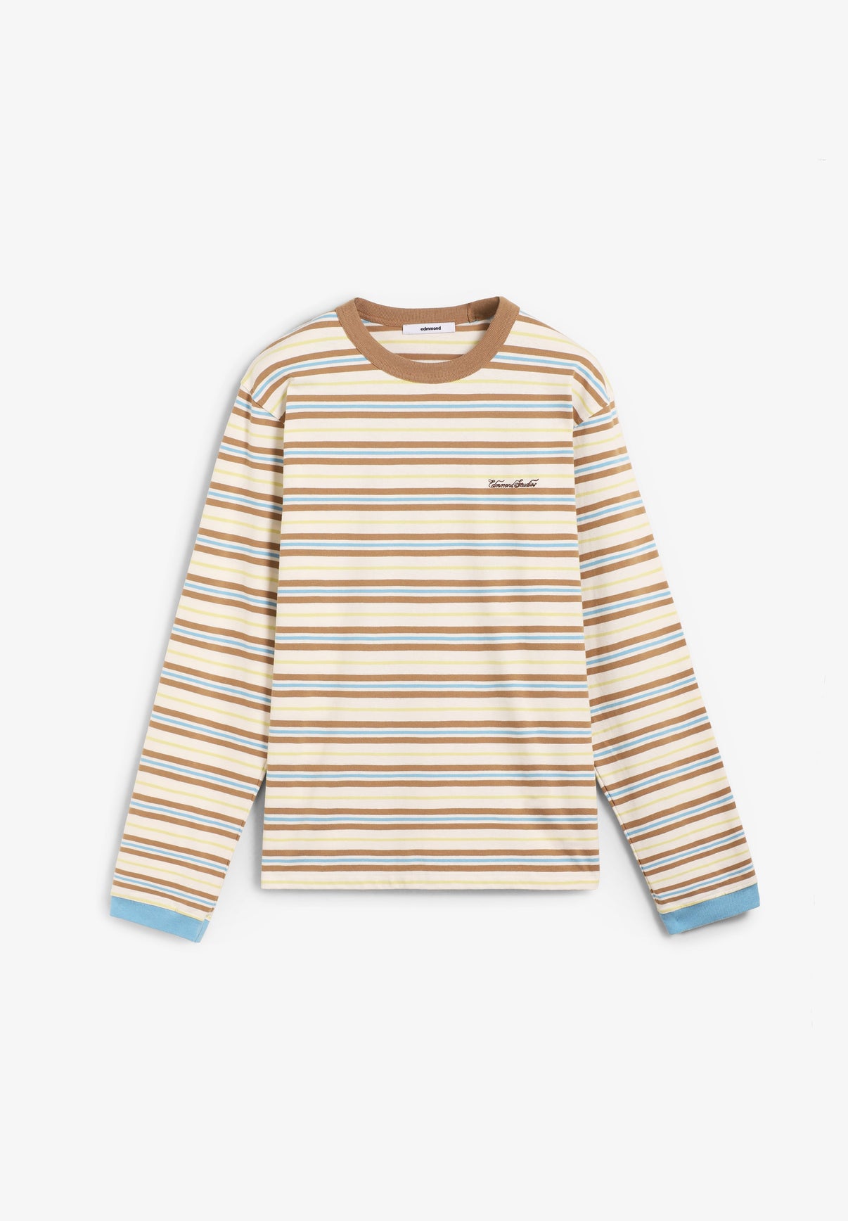 Camiseta Edmmond Studios confeccionada en 100% algodón orgánico, manga larga y corte regular. Presenta cuello redondo, un patrón de rayas horizontales y el logotipo bordado en el lado izquierdo del pecho.