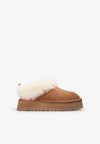 Botas UGG confeccionadas en ante auténtico y una ligera plataforma de 4,4cm fabricada en EVA. El interior está forrado en piel de oveja que se extiende por el puño fijo. Presenta un ribete textil fabricado en poliéster y detalle de etiqueta de ante en el talón que el logotipo.
