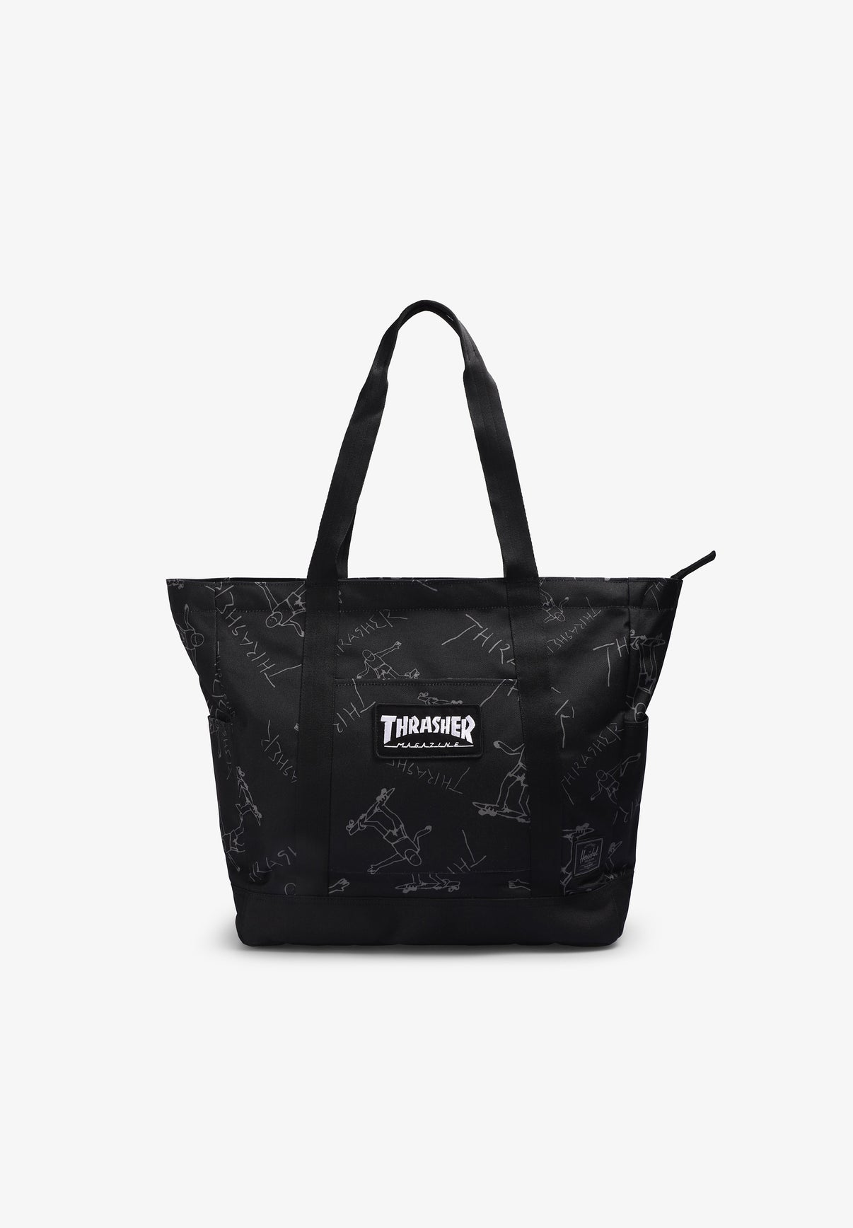 Bolso Herschel estilo tote confeccionado en 100% poliéster 600D reciclado. Cuenta con un forro estampado Thrasher, funda flotante acolchada y forrada de polar que se adapta a un portátil de 15"/16", cierre de cremallera con tiradores de cordones, correa interna con velcro, asas de transporte suaves, bolsillo delantero, dos bolsillos para botellas de agua, clip para llave y logotipo bordado de Thasher.