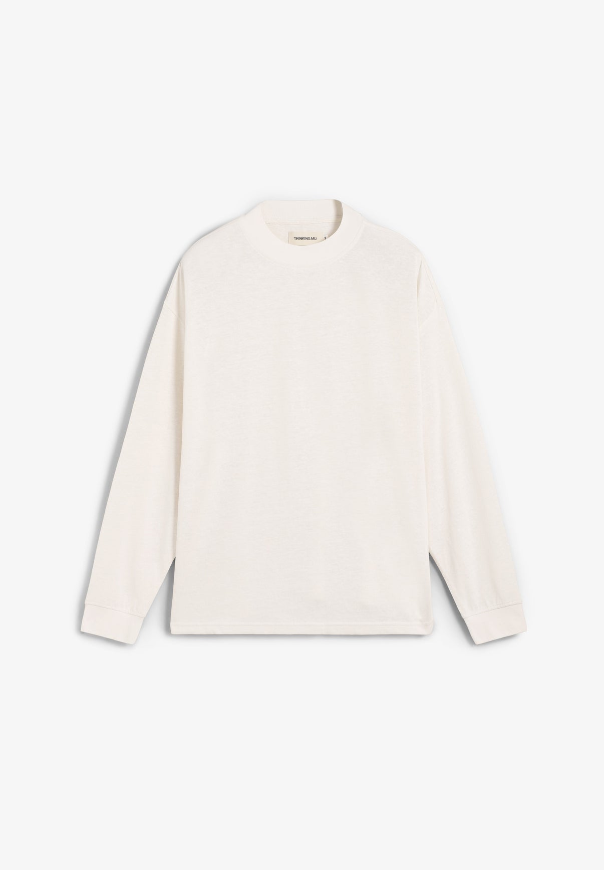 Camiseta Thinking Mu confeccionada en 55% cáñamo y 45% algodón orgánico. Presenta un corte oversize, cuello redondo de canalé y manga larga.