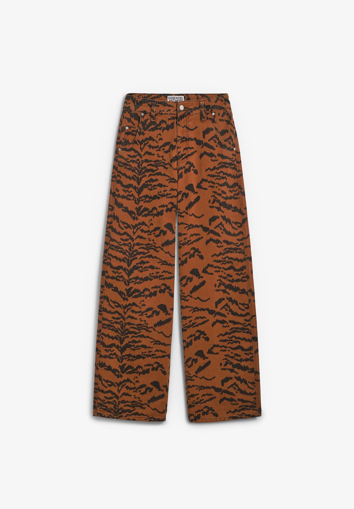 Vaqueros Essentiel confeccionados en 100% algodón y diseñados con una silueta relajada. Cuentan con un atrevido estampado de tigre, talle alto, cierre con cremallera y botón plateados, cinco bolsillos y trabillas para el cinturón.