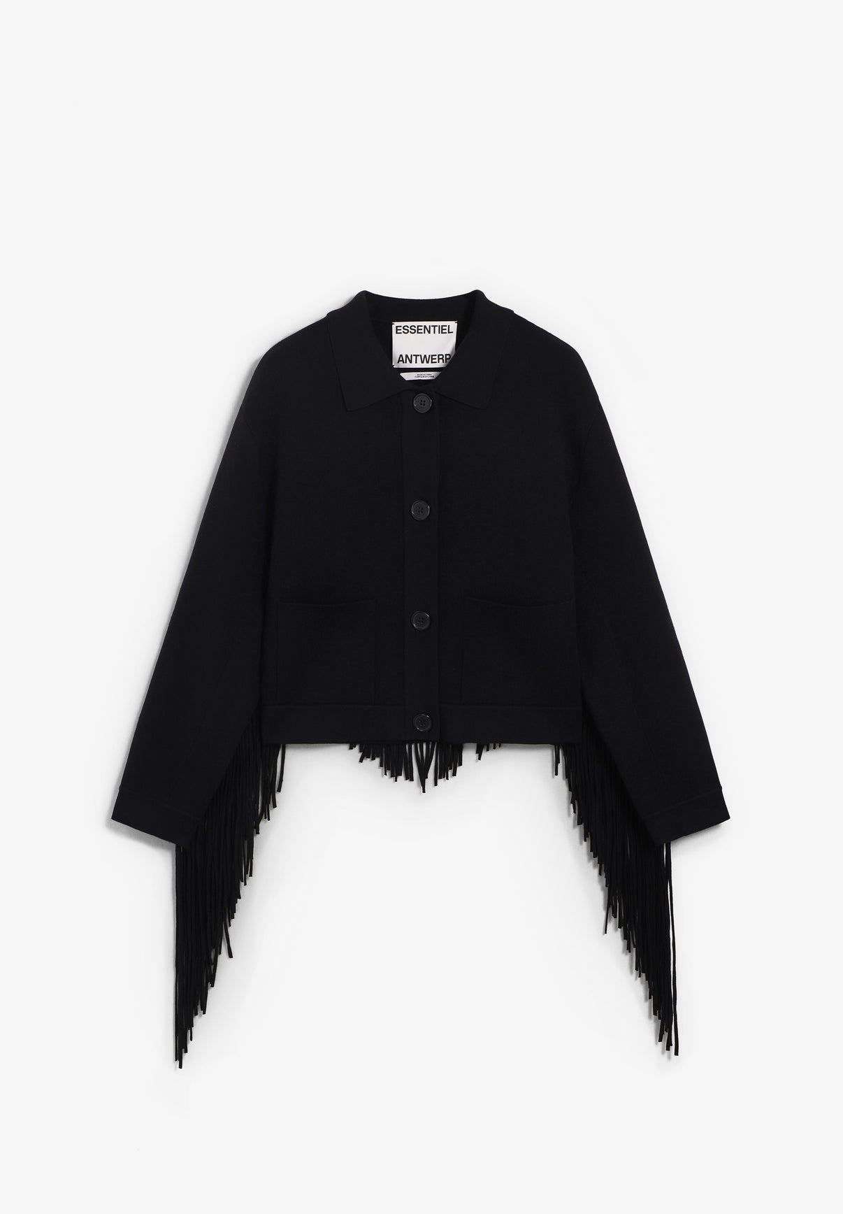 Cardigan Essentiel confeccionado en mezcla de tejidos: 43% viscosa, 25% poliéster, 24% poliéster reciclado y 7% poliamida. Diseñado con hombros caídos para complementar la silueta de corte relajado, corte cropped, dos bolsillos de parche y cierre con botones del mismo tono. Flecos en la parte trasera que añaden movimiento y fluidez a la prenda.