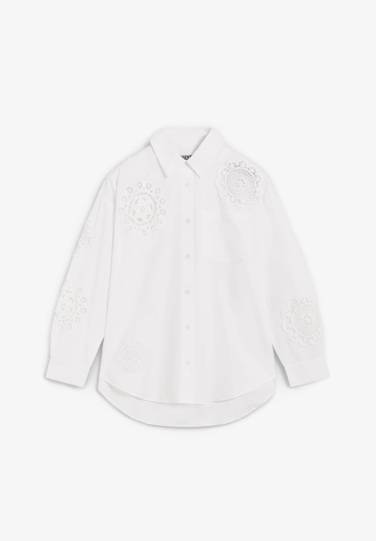 Camisa Essentiel confeccionada en 100% algodón. Presenta una silueta oversize y hombros caídos. Cuenta con cierre con botón, bolsillo en el pecho y dobladillo redondeado más largo por la parte trasera para una mayor cobertura. Delicados detalles de patchwork con encaje.