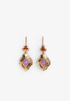 Pendientes Alhaja Cult Store inspirados en la calma y la energía de Ibiza y Formentera. A su característica silueta se unen piedras que transforman su simbolismo: la central, en color lila, asociado a la serenidad, introspección y belleza y, las superiores, en granate profundo, evocan pasión, amor e intensidad. Flash baño en oro y piedras en cristal.