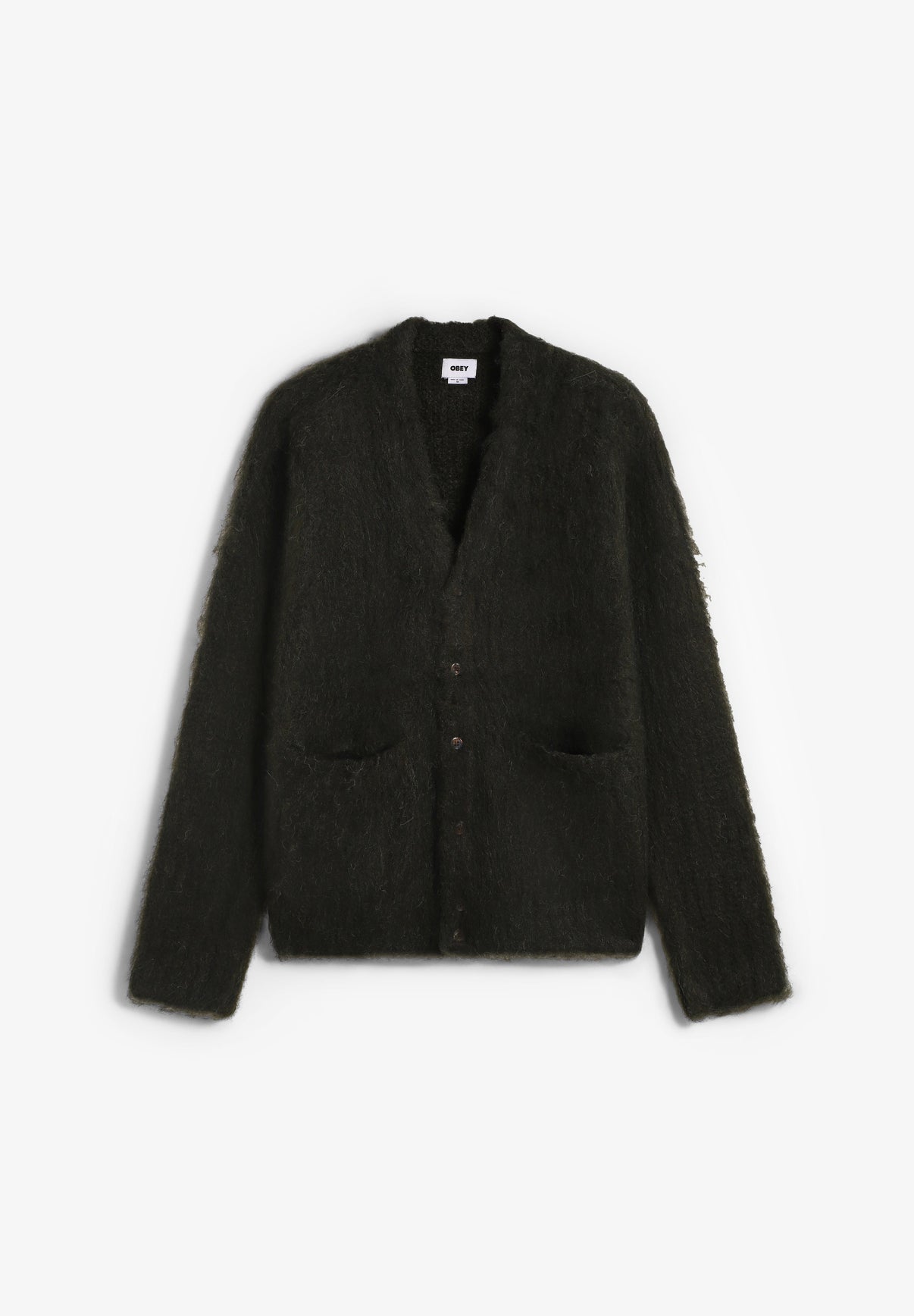 Cárdigan Obey confeccionado en mezcla de tejidos: 50% acrílico, 25% nailon, 20% lana y 4% alpaca. Cuenta con cierre completo de botones, cuello acanalado, bolsillo de rizo, cintura, puños y ajuste regular.