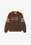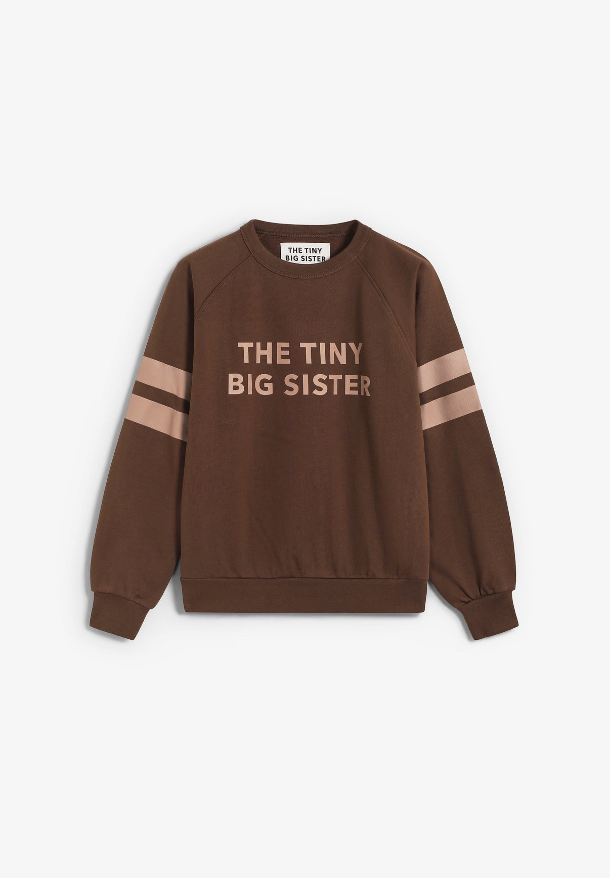 Sudadera The Tiny Big Sister confeccionada en mezcla premium de algodón pima y algodón orgánico en tono cacao. Presenta el logo en el pecho a sobretono y rayas impresas en las mangas, cuello y bajos acanalados y silueta atlética.