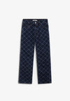 Pantalón vaquero The Tiny Big Sister confeccionado en denim índigo con estampado geométrico floral realizado con láser. Cuenta con cierre con cremallera y diseño clásico de cinco bolsillos. Silueta de pierna más ajustada.