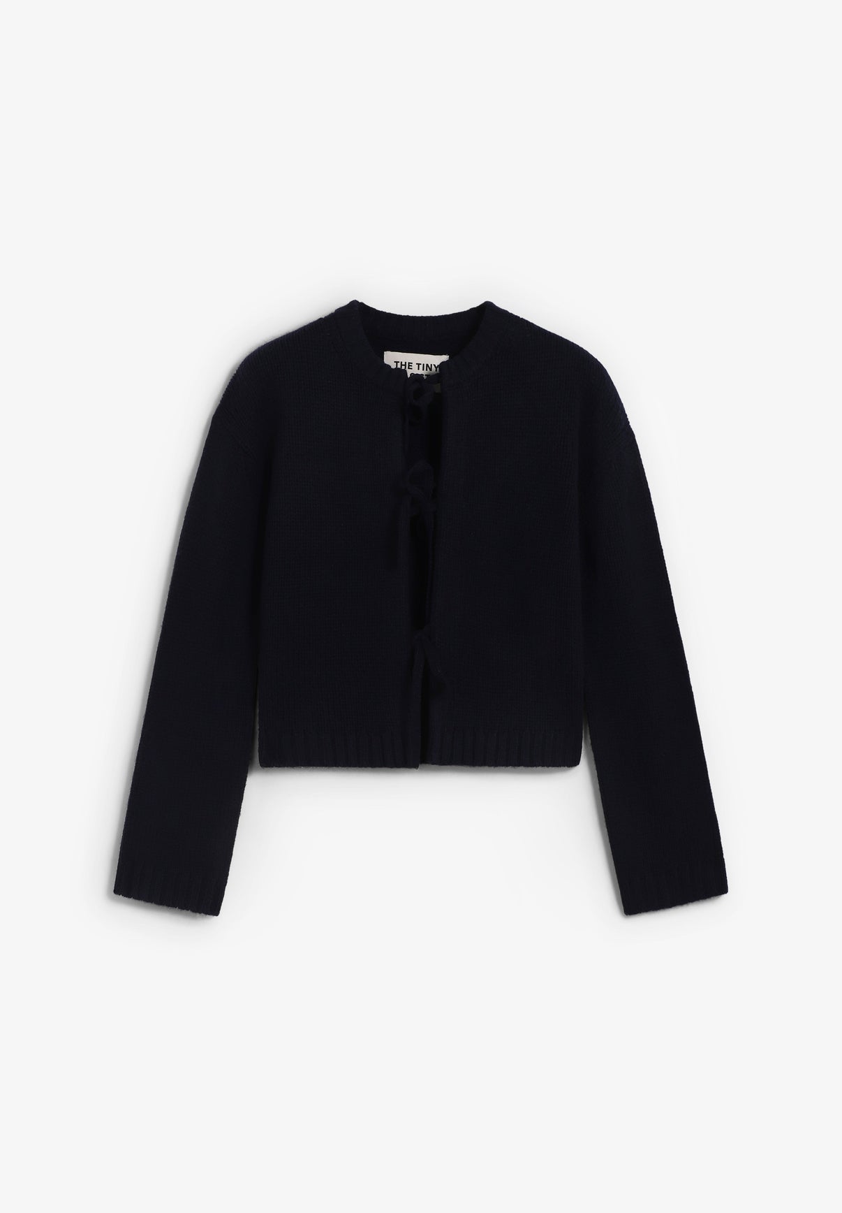Cardigan The Tiny Big Sister confeccionada en 100% lana merino. Presenta cuello redondo, bajos acanalados y una abertura frontal con cierre de encaje. Su silueta ligeramente cuadrada y mangas anchas ofrecen un corte moderno y de textura suave.