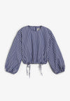 Blusa The Tiny Big Sister confeccionada en popelina de algodón a rayas teñidas en hilo sobre una base azul marino. Presenta cuello redondo, cierre trasero con botón, hombros caídos y mangas ligeramente abullonadas. El bajo está acabado con túnel y lazos ajustables a cada lado.