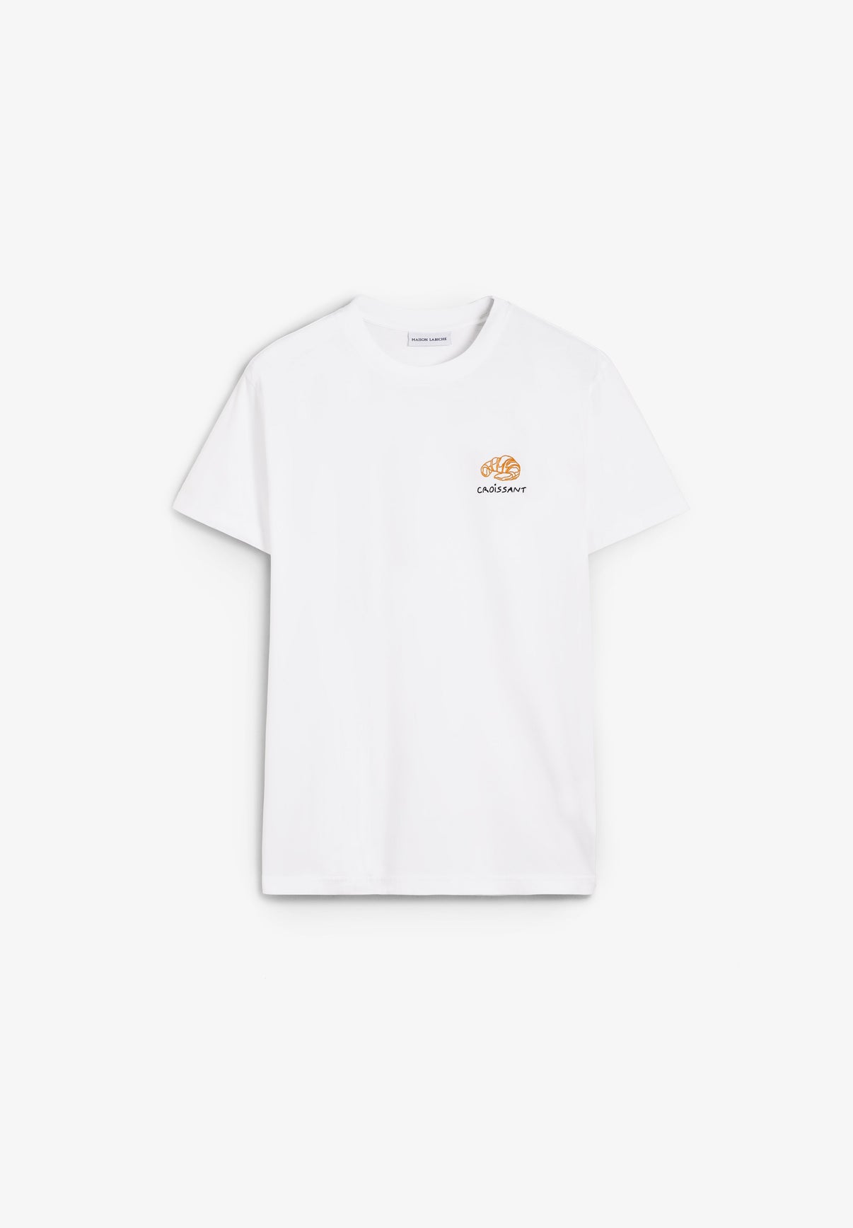 Camiseta Maison Labiche confeccionada en 100% algodón orgánico. Presenta un corte recto, cuello redondo acanalado, ribete interior y doble pespunte en los bajos. Bordado en el pecho que es una delicia matutina.