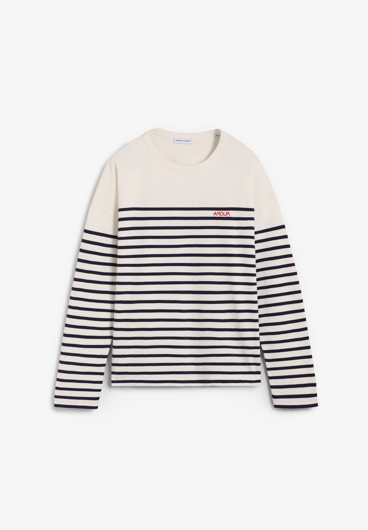 Camiseta Maison Labiche confeccionada en 100% algodón orgánico. Presenta un corte holgado y cómodo, sisas caídas, aberturas laterales y una espalda ligeramente más larga. Su bordado evoca la más bella de las sensaciones.