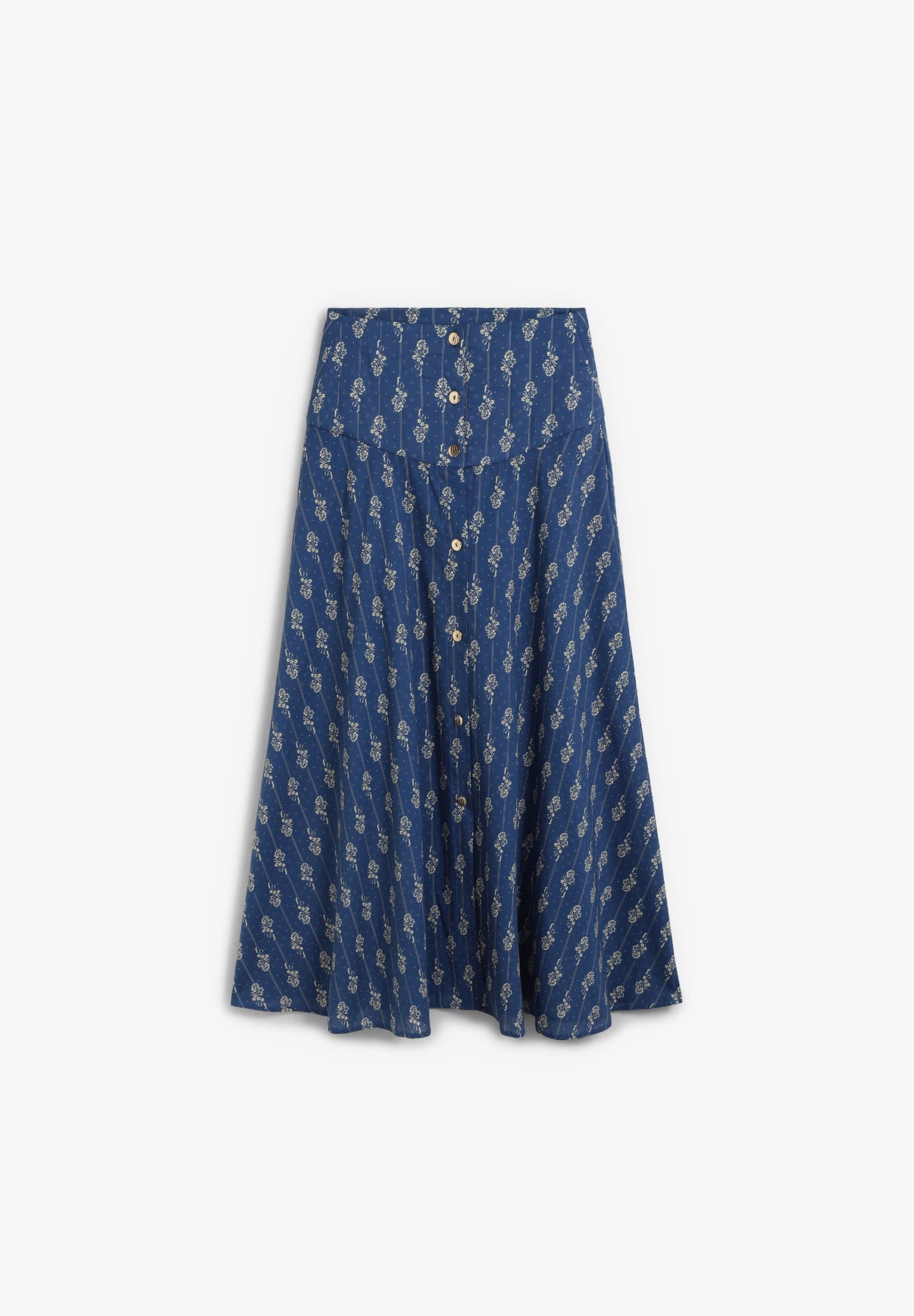 Falda Josephine confeccionada en algodón con estampado de flores crudas sobre fondo azul. Cintura ancha acolchada y corte a capa que realza la silueta. Lleva botones metálicos dorados.