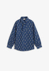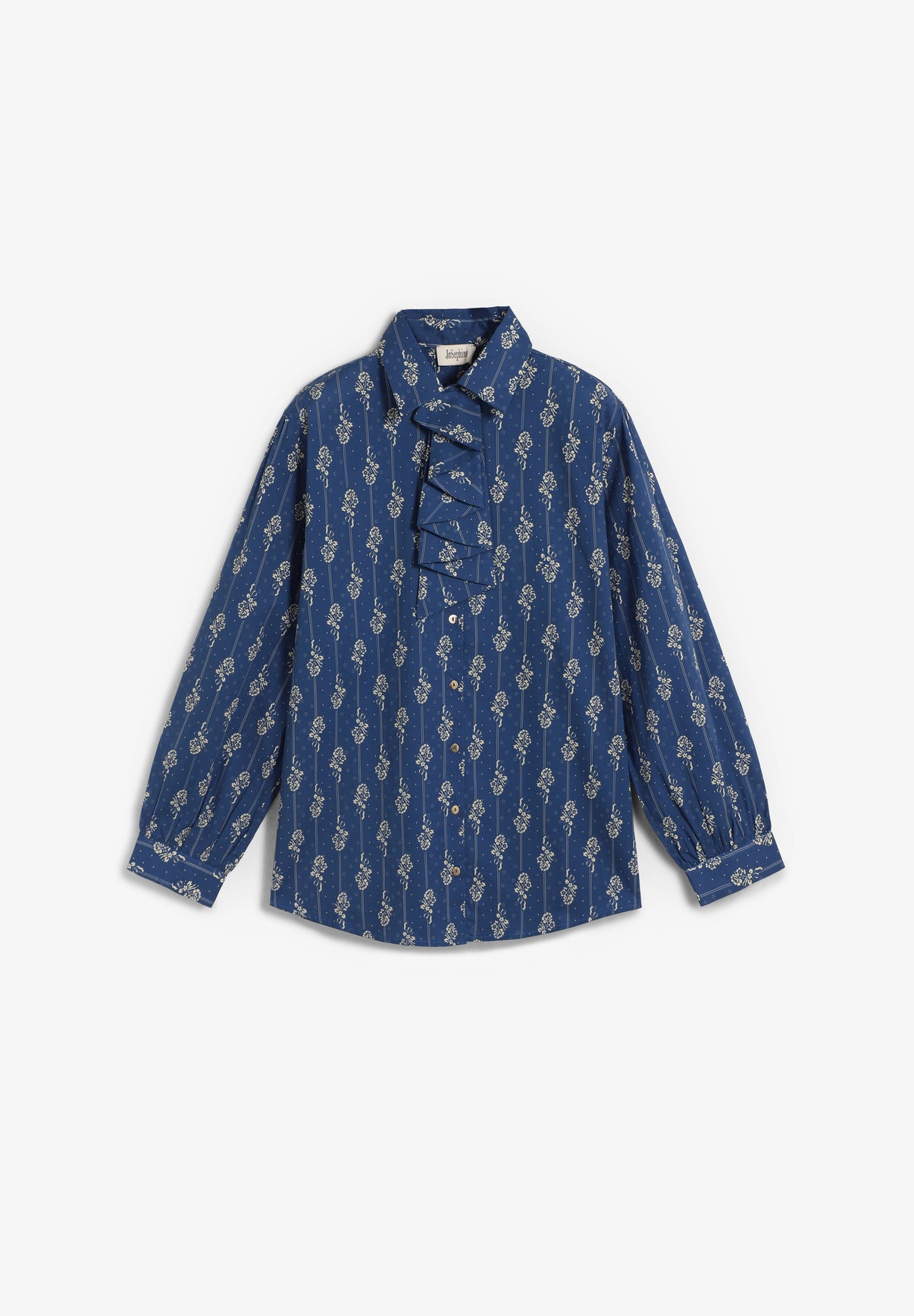 Camisa Josephine confeccionada en algodón con estampado de flores crudo sobre fondo azul. Presenta un cuello de corte clásico y detalle de chorrera removible que se ajusta con un botón. De corte recto y cierre frontal con botones metálicos dorados y manga larga acabada en puño y botón.