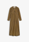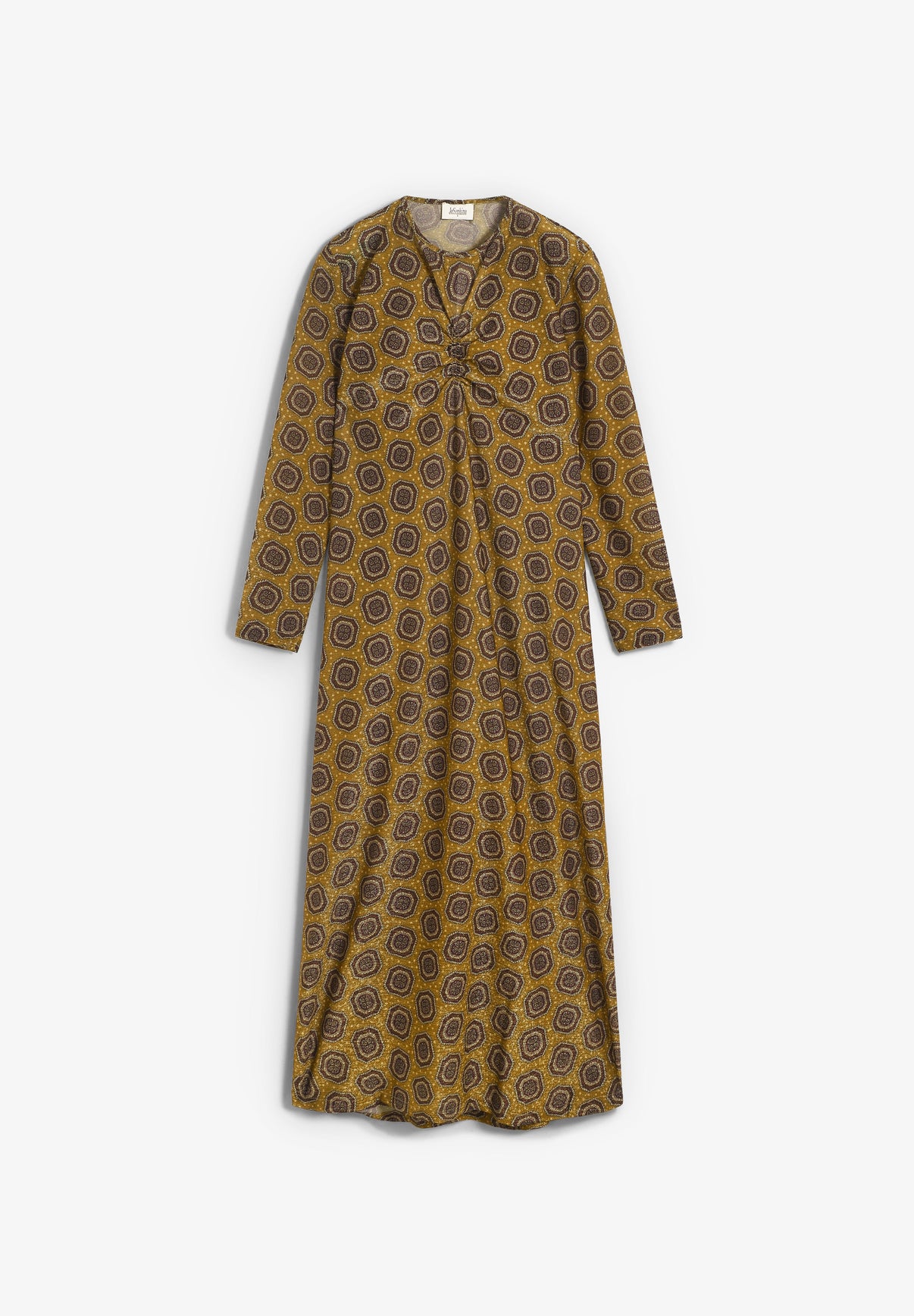 Vestido Josephine confeccionado en punto de lurex. Presenta un estampado geométrico tipo pañuelo en tonos marrones y berenjena sobre un fondo verde ciruela. Escote redondo con frunce en el pecho, manga larga y corte recto relajado.