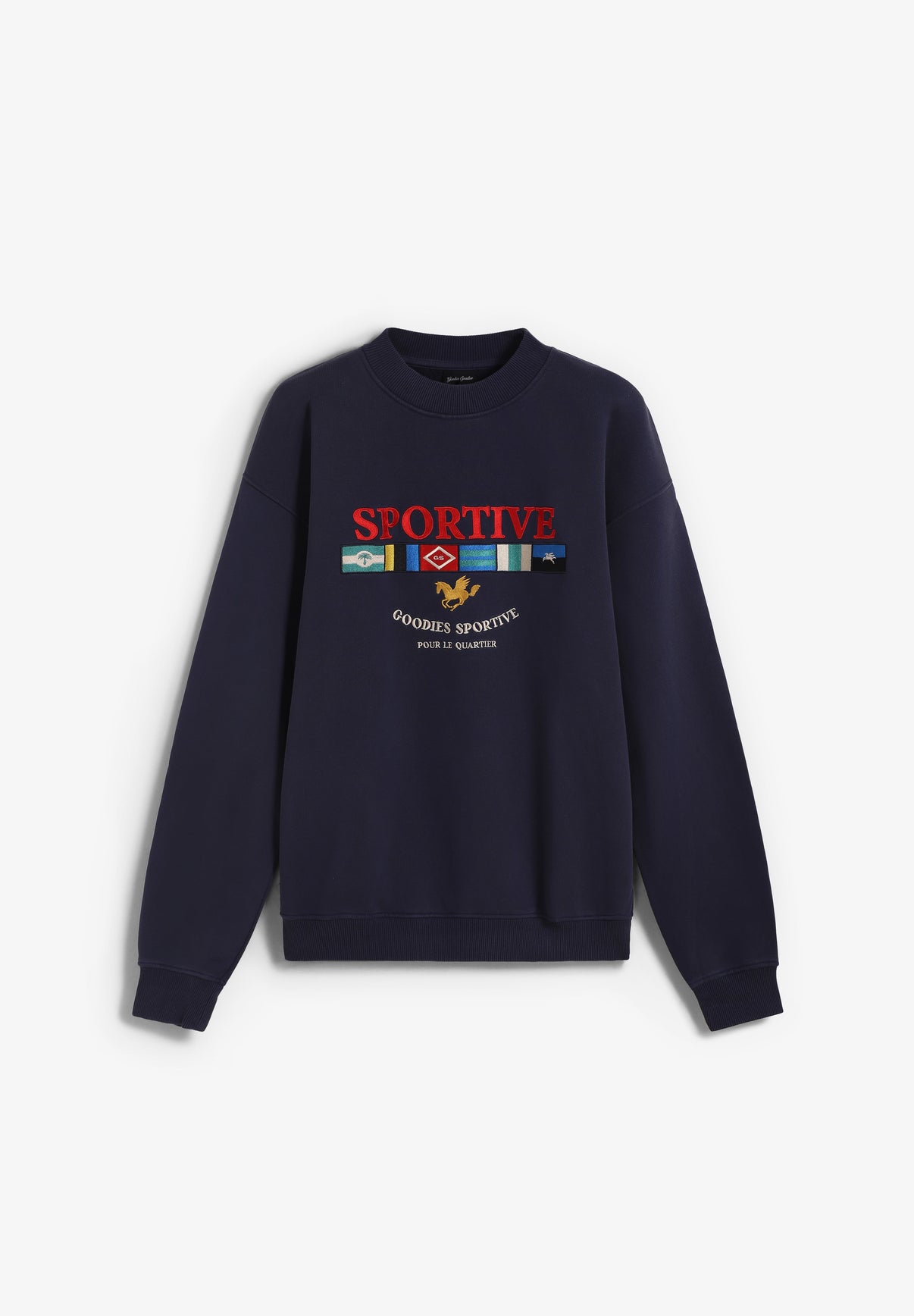 Sudadera Goodies Sportive confeccionada en algodón pesado. Cuenta con cuello redondo y banderas vintage bordadas en el pecho.