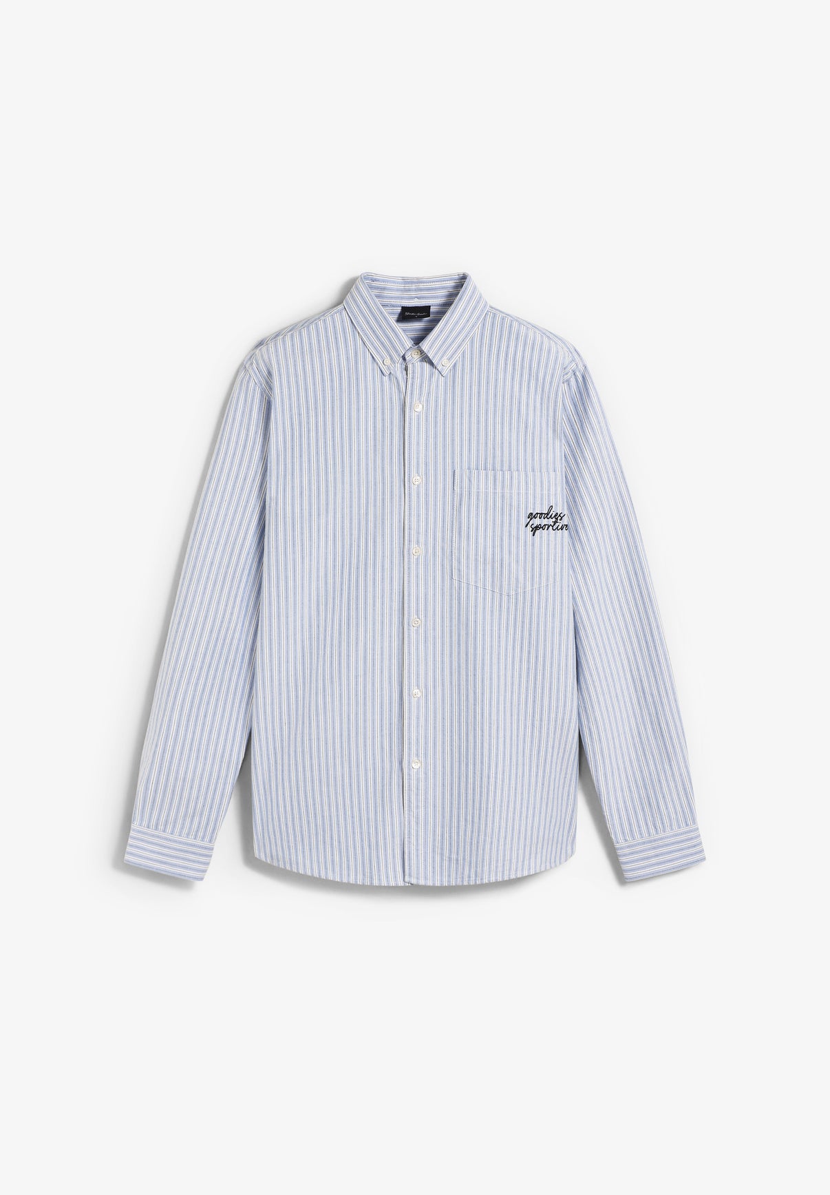 Camisa Oxford Goodies Sportive confeccionada en 100% algodón y ajuste relajado. Cuenta con un bolsillo frontal descentrado, bordado deportivo Goodies y un diseño de base azul con rayas negras.