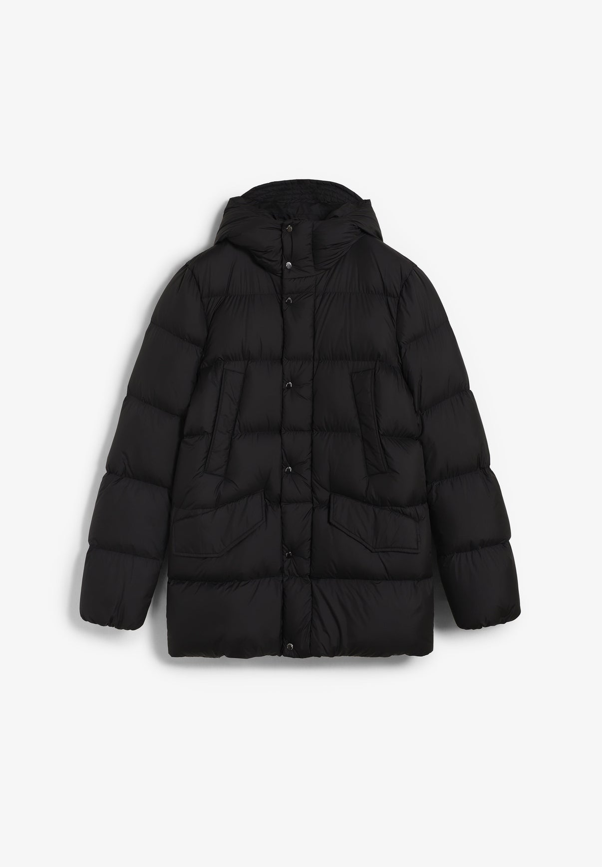 Abrigo Woolrich confeccionado en microfibra. Presenta un tejido hidrófugo y resistente al viento y un relleno de plumón de pato 90/10. Diseño de acolchado horizontal, capucha ajustable con tope y visera, cuello alto, cierre con cremallera oculta, bolsillos de ribete en el pecho, bolsillos con solapa y botones a presión ocultos, bolsillo interior con cremallera, cordón interno en el bajo y logotipo estampado en la parte delantera de la capucha. Detalle etiqueta lateral.