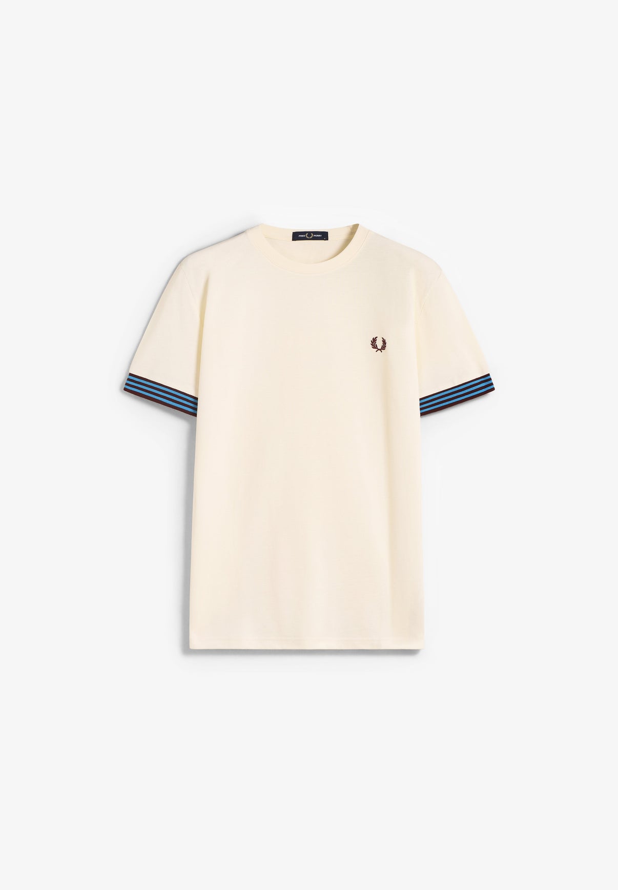 Camiseta Fred Perry confeccionada en piqué de algodón ligero, corte recto y cuello redondo. Cuenta con puños de diseño de rayas realizado mediante hilos teñidos y logotipo de la corona de laurel bordado en el lado izquierdo del pecho.