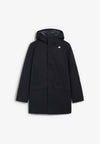 Abrigo K-Way confeccionado en tela de sarga de poliéster impermeable, repelente al agua y cortaviento. Cuenta con tela de forro suave, asilamiento ligero de PrimaLoft, grado de calor medio, costuras selladas con calor, capucha no desmontable con cordón ajustable y bloqueo de cordón, cierre de cremallera oculto, dos bolsillos calienta manos en el pecho y dos con solapa y cierre a presión. Parche de logo de silicona blanca en el pecho.